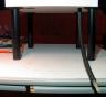 Am Absaugarm ist direkt neben dem Teller ein vertikales Holzplättchen in Höhe des Tellers, dadurch bleibt die Platte bei der Absaugung plan.